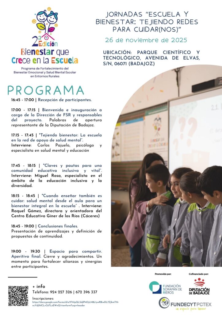 El próximo miércoles 26 de noviembre, el Parque Científico y Tecnológico de Badajoz (Avenida de Elvas, s/n) acogerá las Jornadas Escuela y Bienestar: Tejiendo redes para cuidar(nos), un espacio de encuentro y reflexión en torno a la importancia del bienestar emocional en el ámbito educativo.